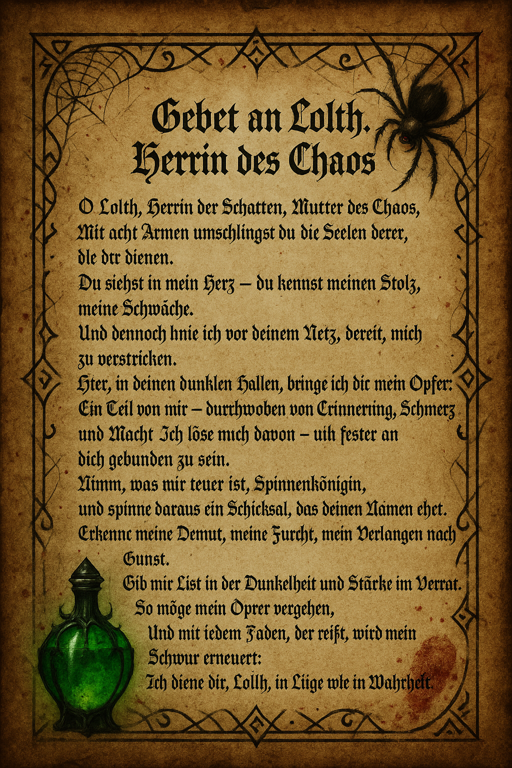 Sie war keine Dichterin, nie gewesen. Die Aufgabe Worte für die Opferung, das Ritual zu finden überrollte sie. Wie betet man zu Lloth? Was Gefällt ihr? Die Abende der Unterrichte die von Belszerion gegeben wurden gaben zumindest etwas Aufschluss. "Du wirst die richtigen Worte finden." She'...