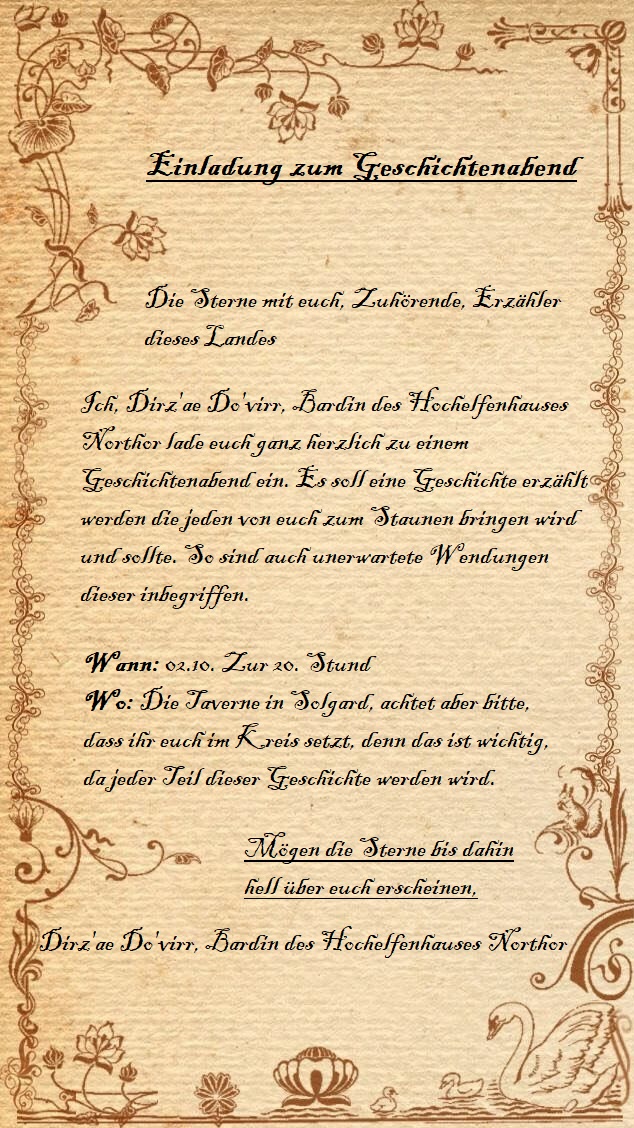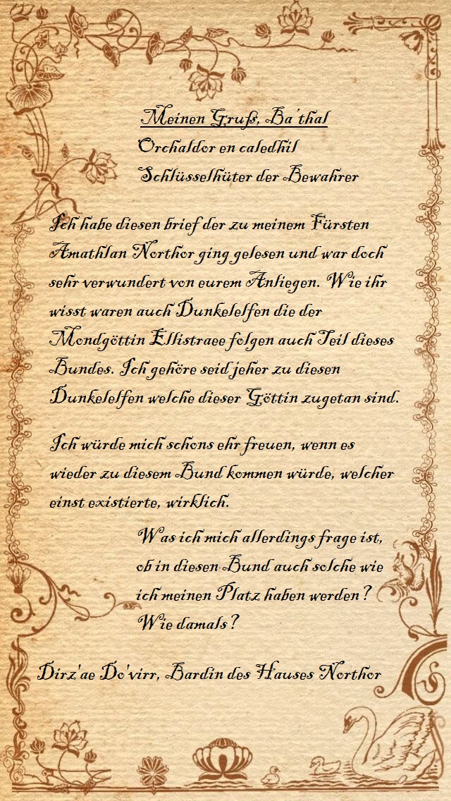Grüß euch,Liltha Calad Faen Es ist vieles geschenen, was mich fort bleiben lässt doch ich geb die Hoffnung nicht auf, dass ich eines Tages ein festerer Teil der Insel sein werde. Da ich bei euch nie schlechte Erfahrungen gesammelt habe stimme ich diesem Treffen zu. Eine Bitte habe ich aber welche i...