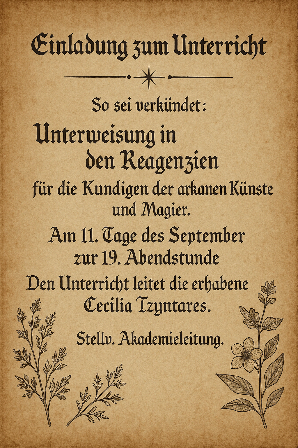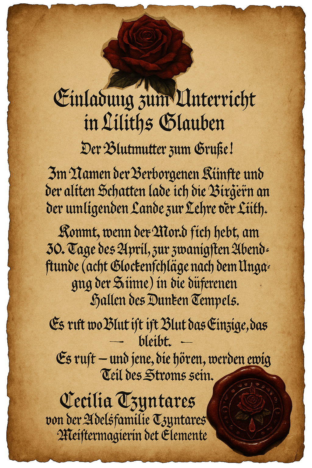 Einladung zum Unterricht in Liliths Glauben Der Blutmutter zum Gruße! Im Namen der verborgenen Künste und der alten Schatten lade ich die Bürger der umliegenden Lande zur Lehre der Lilith ein. Kommt, wenn der Mond sich hebt, am 13. Tage des August, zur zwanzigsten Abendstunde (acht Glockenschläge na...