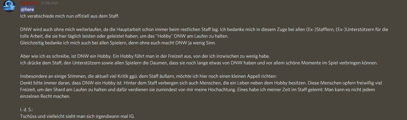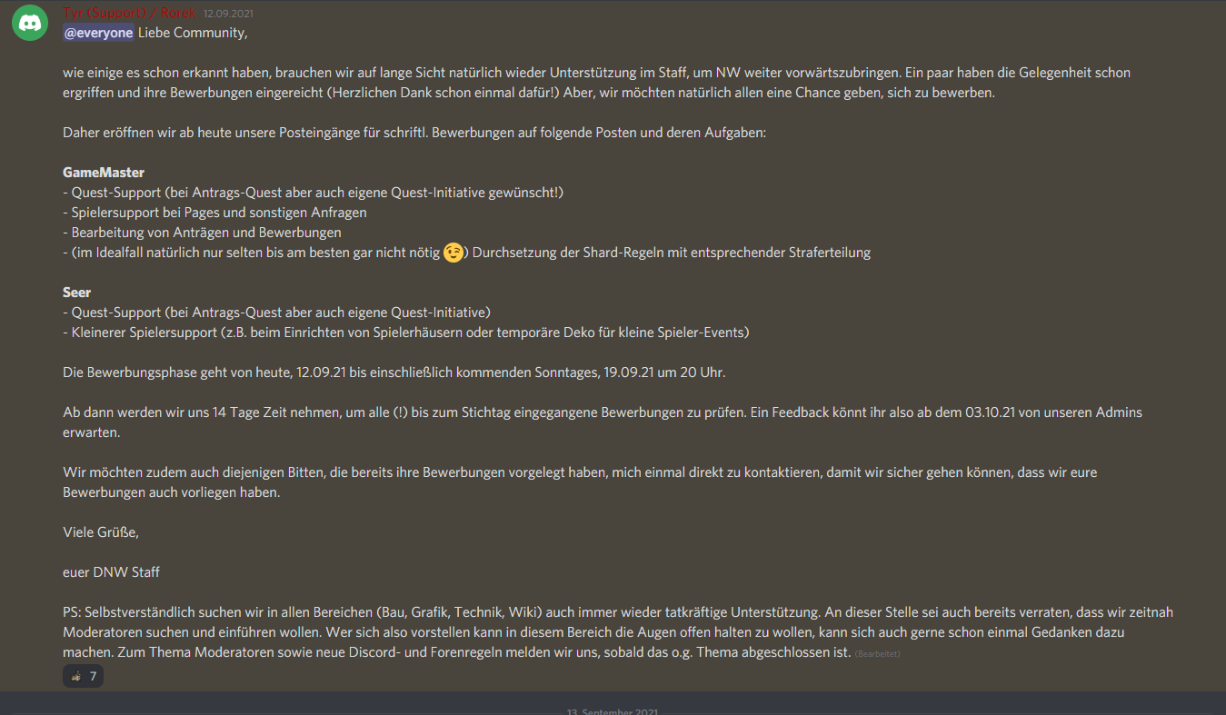 Und bevor nun der Transparenz-Hinweis kommt: Ja, wir haben uns Transparenz auf die Fahne geschrieben und leben diese auch. Wir geben viele Informationen preis, sofern diese Informationen für den Spielbetrieb oder die Entwicklung DNWs spruchreif und entscheidend sind. Ob nun technische oder IG Entwicklungen. Das betrifft jedoch nicht die internen Entscheidungswege innerhalb des Staffs, denn andernfalls müssten wir auch jede eingegangene Bewerbung, jeden Antrag oder jede Beschwerde offen kommunizieren und kommentieren und damit wäre ebenfalls niemandem geholfen.
