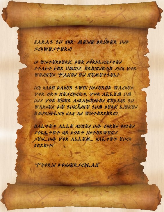 *Er las die Zeilen des Briefes mit einem Ausdruck von Sorge, tiefe Falten bildeten sich auf seiner Stirn. Als ihn vor wenigen Sonnenläufen die Kunde über die seltsamen Portale rund um Ansilon erreichte, war er noch gelassen... jedoch betraf es nun die Stadt im Norden des Landes. Von dort aus wäre es nur ein Katzensprung ins Gebirge und somit vor die Tore Bar Gorls.