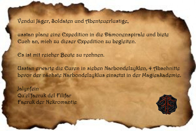 *Das Schreiben wird von einem Dunkelelfen mitten in der Nacht, still und heimlich, an der Bank angeschlagen, ehe der Elf sogleich wieder in der Schwärze der Nacht untertaucht, so schnell, wie er aufgetaucht ist.*