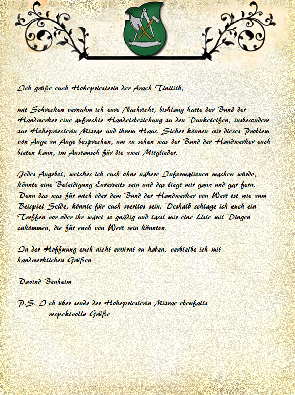 Er nahm die Nachricht mit ins Haus und öffnete sie und voller Entsetzen, las er die Zeilen mehrere Male. Panik stieg in ihm hoch, wie konnte das nur geschehen, sofort setzte er sich an den Tisch und verfasste mit zittrigen Händen, mit ernster Mine und aschfahlem Gesicht eine Nachricht. Jarii und Konstantin waren von den Dunkelelfen gefangen genommen, warum auch immer, bestand doch bislang ein Handelsverhältnis mit den Dunkelelfen.