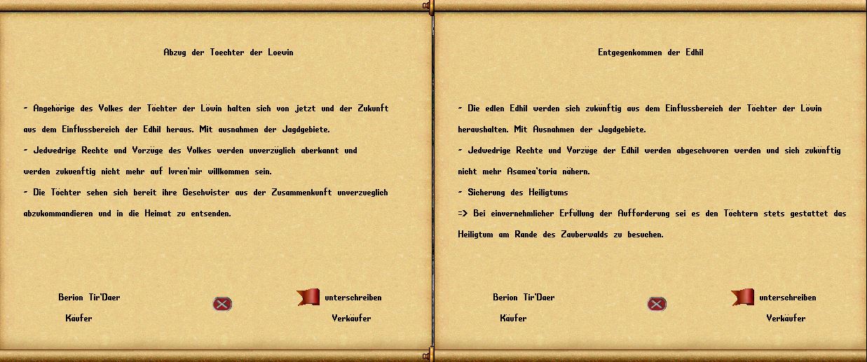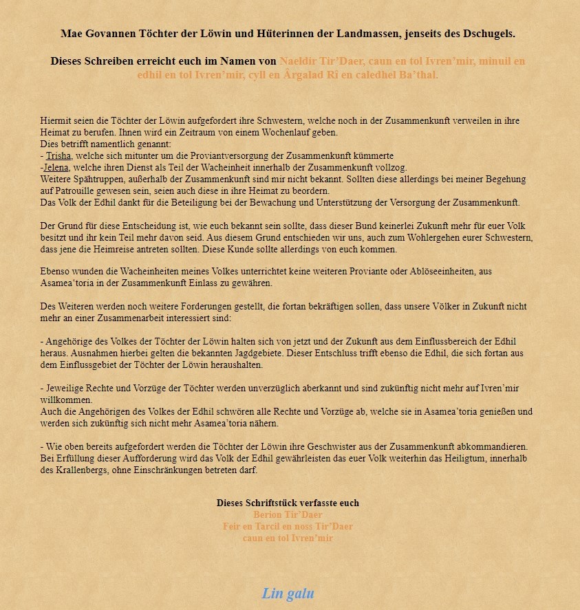 ego habe das Gespräch mit meinen Aeritaneí gesucht et mit Ihnen beraten was die Zukunft der Zusammenkunft et eure Forderungen betrifft. Leider sind wir noch zu keiner Einigung gekommen et einige sind verreist. Daher bitte ego um Aufschub eurer Frist. Ego wäre aber bereit gerne persönlich mit euch auf neutralem Boden darüber zu reden, sofern Ihr mir meine Sicherheit zusagt.