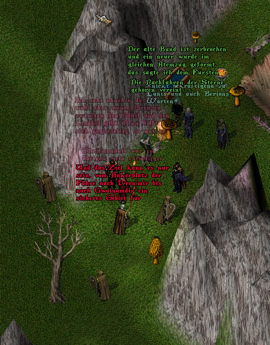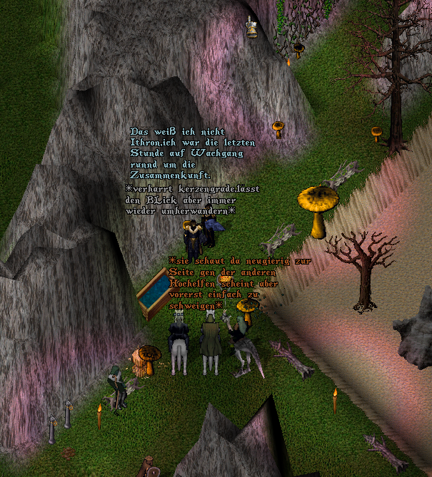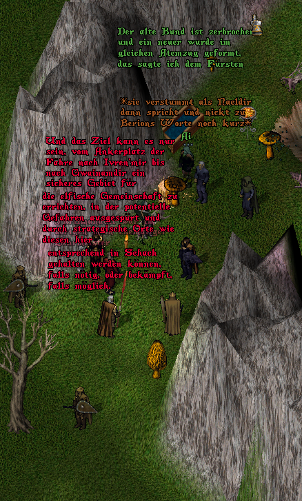 Am Abend war es so weit. Wie die letzten Tage zuvor machte auch diesmal sich Berion auf den Weg, die Zusammenkunft ein weiteres mal zu begehen, doch diesmal nicht alleine. Wie so oft traf er Naeldir in der Schmiede und wie so oft in den letzten Tagen hatte er das Gefühl das sein Tarcil mit seiner Rüstung verschmolzen sei, wie es Sand tut, wenn es auf Wasser trifft. Doch Berion konnte ihn auch verstehen. Man sah es ihm an, dass die aktuelle Situation, schon seid dem Vorfall dieser Balgwechsler ihn beschäftigte. Besonders aber war es jene Zeit, als die ersten Entschlüsse getroffen wurden, wie man weiter mit den Bruchstücken dieses gescheiterten alten Bundes unzugehen hat. Die Zusammenkunft war eines dieser Bruchstücke, ein Ort welches im Territorialen Bereich der Elfen liegt.