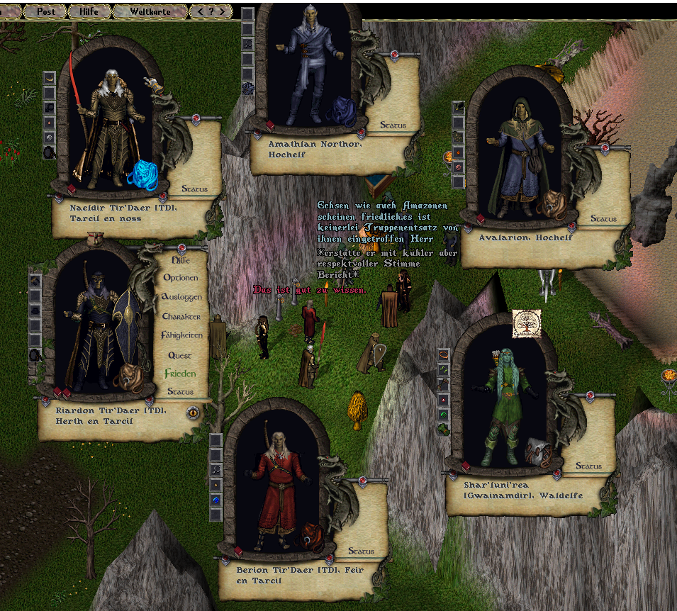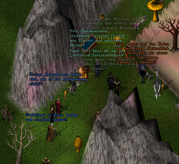 Nach kurzer Zeit erreichte auch Tarcil Naeldir Tir'Daer sowie seine rechte Hand Berion die ehemalige Zusammenkunft und inspizierte die bisherigen Maßnahmen. Nochmals wurden auch die noch verbliebenden Amazonen sowie Echsen höflich kühl nach Bedürfnissen wie Nahrung oder anderweitiger Hilfe befragt. Danach erfolgte noch eine längere Lagebesprechung und Berichterstattung gegenüber dem Oberhaubt des Hauses Tir'Daer. Allein seine Anwesenheit, sowie die seiner rechten Hand machten allen Beteiligten den Ernst der Lage nochmals deutlich. Danach rückte der gesammte Trupp wieder ab, die Befehle waren klar. Immer wieder würde auch der Herth mit einigen Soldaten zur ehemaligen Zusdammenkunft reisen und dort nach dem Rechten schauen. Viele Augen ruhten nun auf jenem Ort, das war nur allzu deutlich.