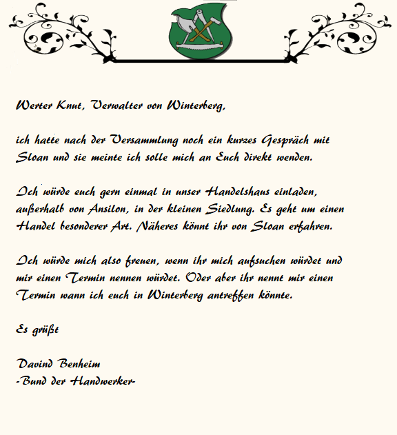 Er soll ausrichten, dass Davind es am heutigen Tag zur angegebenen Stunde versuchen will, in der Taverne zu Winterberg zu erscheinen. Solle er es bis zum halben Stundenglas zur achten Stunde nicht da sein, würde er dann auf jeden Fall am Tag des Donnerst zur angegebenen Stunde dort sein.