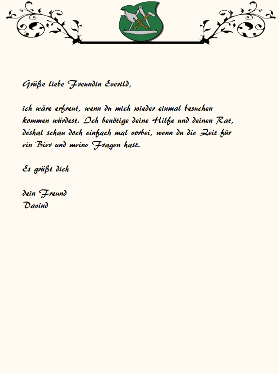 Nachdem er einige andere Nachrichten verfasst hat und gesiegelt hat, kommt als allerletztes an diesem Tag noch eine Nachricht an Everild dran. Schnell wird die Nachricht auf ein Pergament geschrieben und mit einem Boten in den Berg entstandt.