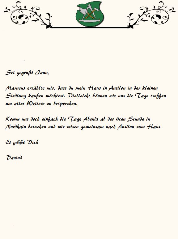 Nachdem er den Brief für Dragomir geschrieben hatte, schreibt er gleich noch an Janu, hatte Marneus ihm ausgerichtet, dass Janu Interesse an seinem alten Haus in Ansilon hat. Dafür wollte er sich mit ihr treffen. Und hinterließ die Nachricht in Ansilon in der Bank.