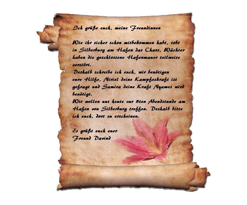 Die goldene Eule, die Niriel ihm für Nachrichten überlassen hatte, wird ein Schreiben für Niriel und Samira in die goldene Stadt bringen und solange warten, bis ihr die Nachricht abgenommen wird, dann wird sie eine gewissen Zeit warten bevor sie dann wieder zurück fliegt.