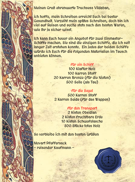 Da sich ein Angebotsaustausch auf diesem umständlichen Wege immer sehr erschwert lade ich euch herzlich ein einige Tage in Silberburg als mein Gast zu verbringen. Bei einer Audienz und weiteren Unterredung finden wir sicherlich eine gemeinsame Einigung. Lasst mich bitte wissen wann ihr gedenkt uns zu besuchen und ich werde euch eine Eskorte schicken die euch sicher empfängt und nach Silberburg geleitet.