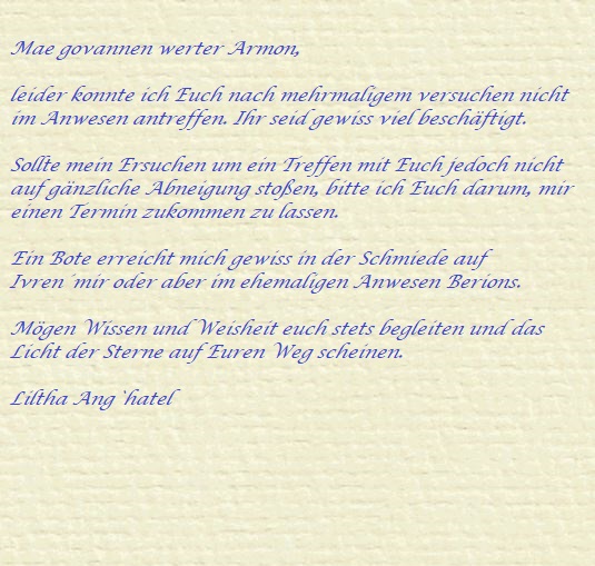 *Ein weiterer Bote wird Armon aufsuchen und ihm Lilthas Bestätigung für den genannten Termin übermitteln.*