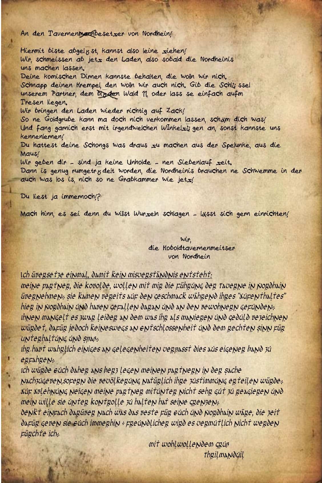 Es ist ein Brief auf Pergament verfasst, der erste Teil in einer kruden und unbeholfenen Schriftart, der zweite Teil darunter in elfisch anmutenden Lettern.