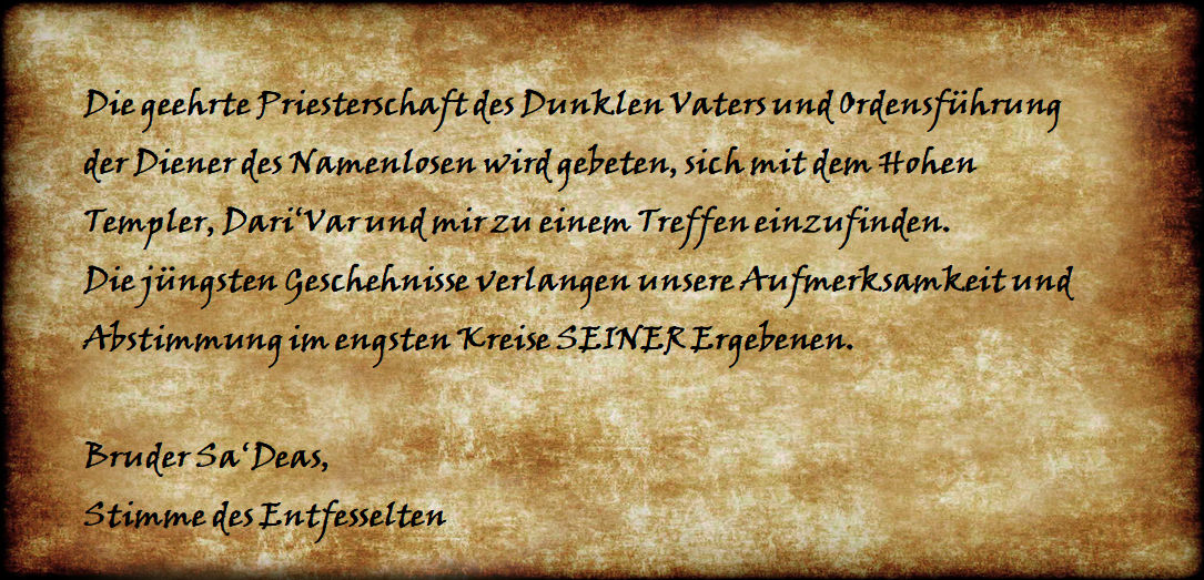 Eine kurze Notiz wird in ihren Gemächern für A'groniam, Marleen, Sejin und Valtysar hinterlassen.