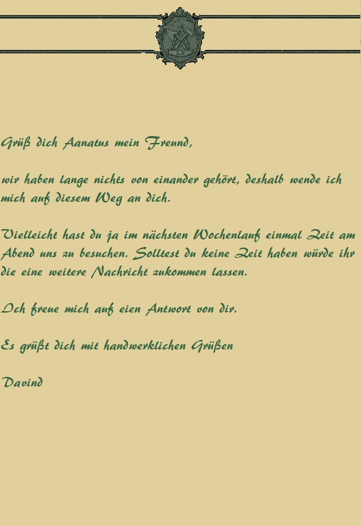 Nachdem ihm Gwendolyn einen Zahn aus dem Kiefer gerissen hat, brutal und ohne Rücksicht, einem breiten Grinsen und Freude im Gesicht stehend ....... jedenfalls kam es ihm so vor ..... hatte er sich nun im laufe der letzten Tage erholen können. Nun hieß es sich den Arbeiten wieder zu widmen. Er schrieb einen Brief an Aanatus, er braucht Informationen von ihm, was die Mine anging. Schließlich gab er die Nachricht einem Boten mit und hoffte auf eine schnelle Antwort.