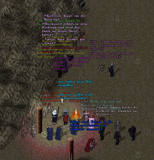 Gegen das mächtige Wirken der Priesterin und der sich der Gruppe angeschlossenen Krieger hat er mit diesem kleinen Knüppel keine Chance. Dies wusste er zwar, dennoch wechselte er mehrfach den Blick auf seine "Waffe". Die Gedanken seine Entführer damit zu erschlagen und zu fliehen waren verlockend. Doch der Knüppel war klein, Knut ist kein Krieger und sie in der Überzahl. Er wusste, dass der Tod oder gar schlimmeres auf ihn warten würde. In einem Moment der Unachtsamkeit, während alle im Kampfe verstrickt waren, versteckte er sich hinter einem alten Gemäuer in der Alten Mine. Er hatte ein Buch erhalten, um den Fortschritt an seiner Tätigkeit dokumentieren zu können und auf eine herausgerissene Seite aus diesem Buch schrieb und zeichnete er Folgendes: