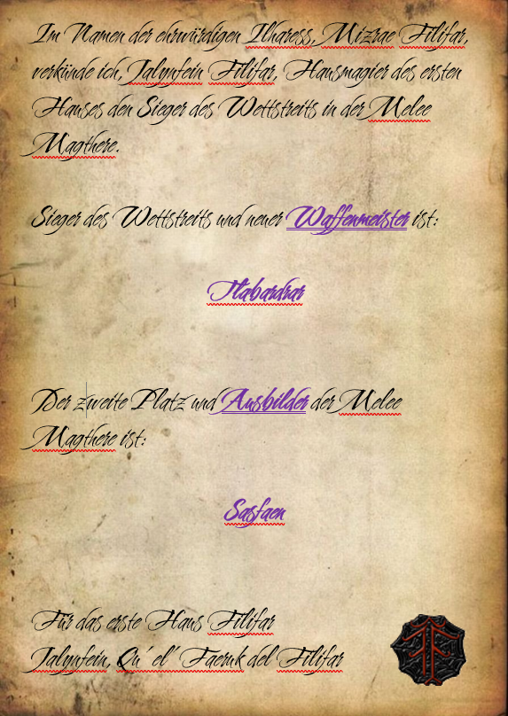 *Jene Aushänge sind überall an den wichtigen Stellen in Sold'Orbb, in der Melee Magthere, in der Sorcere und auch in der Arach Tinilith angebracht worden. Ebenso findet sich jener Aushang am Versammlungsplatz der schwarzen Festung des ersten Hauses Filifar.