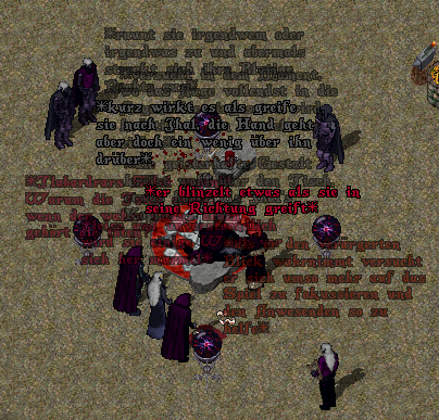 „Ach, es wird sicher bald zu Staub zerfallen, wie diese unnützen Klappergestelle auf dem Totenacker ebenfalls. Soll es bis zum Zerfallen noch hier im Labor leben und meine Forschungen bewachen.“ sagte der Hausmagier mehr zu sich selbst, ehe er sich auf den Weg zur schwarzen Festung des Hauses Filifar machte. Was er nicht bemerkte, war, dass das Teufelchen hinter ihm herlief, als er die Sorcere verließ, in der Nähe des Marktplatzes ließ sich das Teufelchen immer weiter zurückfallen, bis es nicht mehr zu sehen war. Als Jalynfein sich zur Meditation zurückzog, war scheinbar alles in bester Ordnung im Unterreich. Das skelettierte Teufelchen hingegen verschwand in den Katakomben unterhalb von Sold’Orbb, wo wieder einige frische Sklaven, die ihr Leben verwirkt hatten, hingebracht worden waren und nahm einen der leichteren Sklavenleiber mit, um sie auf das Dach der Bank zu bringen. Dort angekommen zerfleischte das Teufelchen den Leichnam und warf mit den Eingeweiden um sich.