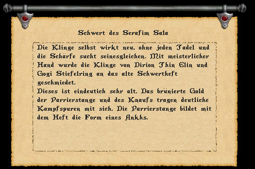 Wie in Trance griff er nach dem Schild und schnallte ihn sich um. Erneut erfasste ihn die Intution und ließ ihn auch das Schwert wieder an sich nehmen, um so, gerüstet in einer von Dirion Thin Elin geschmiedeten Paladinrüstung und den Artefakten Serafim Salas dem Erzengel Thrithemius entgegen zu treten. Jenem Erzengel, welcher einst den Gläubigen des Herrn die eine Quest auferlegte, die ihnen Erlösungen bringen sollte.