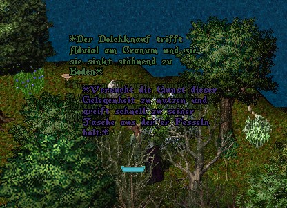 Sie war gerade dabei, abgebrochenes Holz zu sammeln und war somit in ihrer Arbeit vertieft, dieses erkannte XUn'aun und handelte rasch....er schlich sich langsam von hinten an sie heran und griff leise zu seinem Dolch....als er dann nah genug an sie heran gekommen ist, war es dann soweit. Er zog ihr den Knauf des Dolches über den Kopf, wodrauf diese dann bewusstlos zu Boden fiel. Ihr ganzes Holz verteilte sich auf den Waldboden...