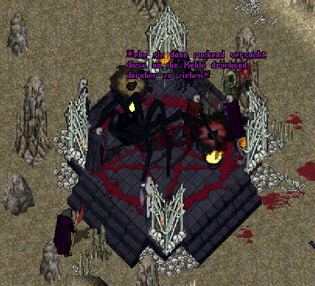 Dort angekommen forderte sie Xun’aun und Taumaril auf die Waldelfe am Altar zu befestigen. Beide folgten diesem Befehl ohne zu zögern. Alle Mitgereisten verteilten sich um den Platz. Belszerion teilte ihnen mit, mit einer gestikulierenden Geste auf einer brennenden Haufen Dunkelelfen der Lloth, das ihr heutiges Unterfangen nicht Risiko frei ist und auch sie sich bei den kleinsten Fehlern, diesen anschließen könnten.