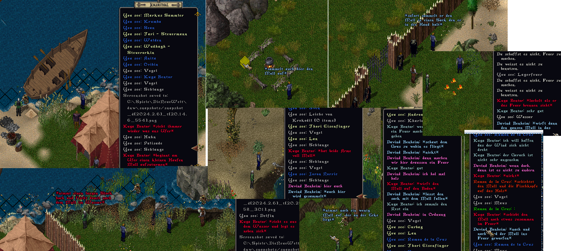 Als er am Abend wieder ans Lagerfeuer tritt, traut er seinen Augen nicht. Wer war denn wohl so dreist und hat dort einen kleinen haufen Müll hinterlassen. Schnell wurde er gesammelt und der Rest des Lagers sollte inspiziert werden, als Kuga auftauchte und fragte ob er helfen könnte. Er deutet auf den Müll und bat ihn mitzuhelfen, einige Zeit später gesellte sich auch Ramon zu ihnen und halb draussen vor den Palisaden den Müll einzusammeln.
