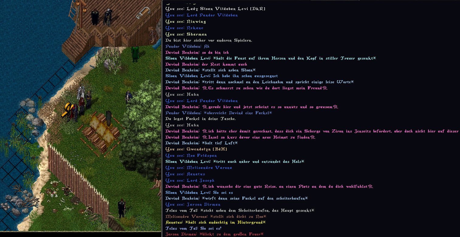 So gingen sie nach oben an Land, um Joshuah die letzte Ehre zu erweisen, ob bekannt oder unbekannt. Aufgebahrt lag er auf dem Stapel Holz den Gwendolyn und Pandor den den wenigen Stunden aufgebaut hatten. Es wurden noch ein paar Worte gesprochen, Sloan betete wie es sich für sie gehörte zum Herrn, andere sprachen stille Worte. Er selbst trat noch einmal näher an den Leichnam und richtete Worte des Abschieds.