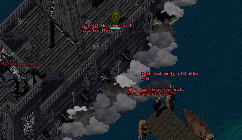 Er musste sich beeilen. Nur solange die Sonne am Himmel stand hatte er Ruhe vor den Schatten die noch immer das Schiff plagten. Trotzdem grinste er, als er vorsichtig einen der violetten Tränke in seinen nächsten Versuch goss. Pulver und alchimistische Sprengmittel hatten ihn schon immer fasziniert, selbst bevor er Hauptkanonier der Prinzessin geworden war. Feuer und Verwüstung, eingepackt und versiegelt. Mit einem ordentlichen Geschütz konnte so wirklich jeder mit einem schummelnden Fingerfuchtler gleich ziehen. Ganz ohne sein halbes Leben in einem Turm zu vergeuden. Alles was man brauchte war ein Funke.