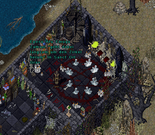 Langsam trat er an das Pentagramm heran und begann es langsam zu umrunden, wobei er leise die Schutzformeln zu Sprechen begann, die den Schutzkreis aufladen und die sich entfaltenden Energien in seinem Innern halten sollten. „In Sanct Ort Grav“, sprach Rorek und verfiel dabei in einen leisen Singsang, wobei der Text des Liedes sich aus einer Aneinanderreihung der Worte der Macht zusammensetzte. Er nutzte dabei sowohl die unter den Menschen geläufigen Worte der Macht als auch die Worte der Blutmagie, stets im Wechsel. „Epesu Atu Emuqa Zamani … In Sanct Ort Grav … Epesu Atu Emuqa Zamani …“ Zwei Mal umrundete er das Pentagramm, bis er schließlich in den Schutzkreis hineintrat und sich im Zentrum aufstellte.