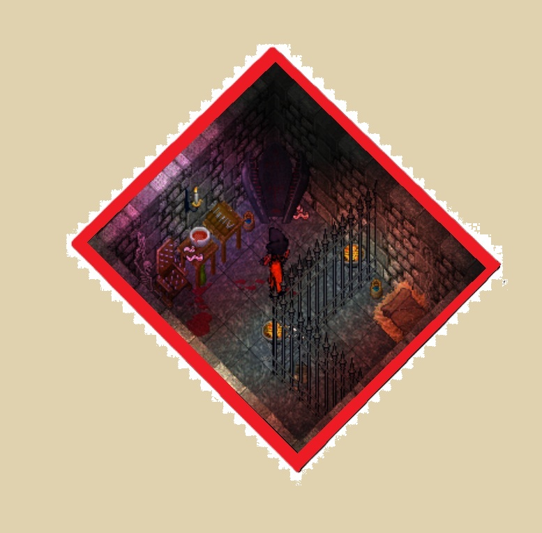 Sie gab sich als Dienerin von Frau Roh'en bekannt und führte Balduin auch schon recht bald zu einem anderen Ort. Er wurde durch mehrere Türen und eine Treppe hinunter geführt, bis sie schlussendlich in einem Raum angekommen waren, welcher eine kleine Zelle beherbergte. Auf einem kleinen Tisch lagen diverse Folterwerkzeuge fein säuberlich aufgereiht. In der Zelle lag eine nackte Frau in Ketten. Cataleya war über sie gebeugt.