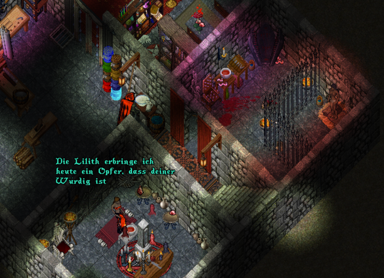 Cataleya verließ die Zelle und wies ihn an nach der Frau, die in Ketten auf dem Boden lag, zu sehen, sie wieder zu Bewusstsein zu bringen. Als er sich über die bewusstlose Frau beugte konnte er sofort Spuren eines Kampfes feststellen. Die Nase war zwar geschwollen, doch nicht gebrochen. Das Haar war abgesenkt und ein paar Holzsplitter steckten in der Haut. Mit Hilfe eines In Mani heilte er die kleineren Wunden. Um sie wieder zu Bewusstsein zu bringen genügte ein doch letztendlich ein Krug Wasser, den er ihr ins Gesicht schüttete. Cataleya selbst blutete auch ein wenig an der Hand, doch wollte keine Hilfe. Das Blut sei ein Geschenk an Lilith.