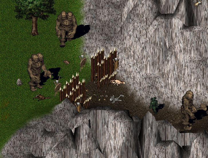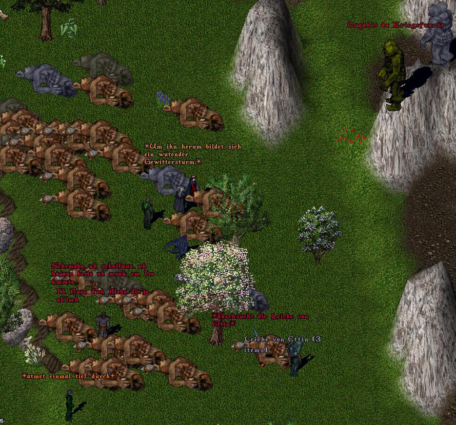 Die Übermacht war gewaltig, egal was der Ettinfürst seinen Widersachen entgegen schickte, zu dutzenden metzelten sie jene nieder, die ihm folgten. Verdammte Menschen! Er hatte sie unterschätzt. Aber sie ihn auch! STerbend ließen sie den einst mächtigen und wütenden Ettinfürsten zurück, während viele seiner Anhänger flohen. Doch ein paar wenige mutige und absolut treue Kampfgefährten schulterten ihren gefallenen Anführer und trugen ihn fort. Orgdhis, halb im Delirium und dem Tode nahe sprach seinen letzten Befehl aus: "In Bärgä!". Sie gehorchten und der gesamte Ettinstamm zog sich von den Ogerbergen zurück. Zu heftig war die Niederlage. Zu nah der Schrecken. Sie zogen sich also weit in die Berge im Nordosten zurück, hinter dem kleinen Waldstück.