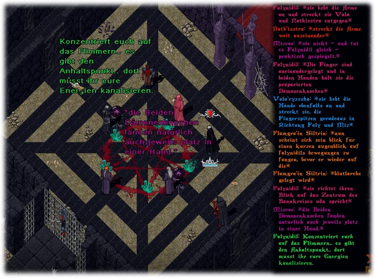 Aufmerksam sondierten alle Priesterinnen das Arreal, ehe die Iharess Kommandos aussprach. Mizrae, als mächtigste der übrigen Priesterinnen, sollte sich gegenüber ihrer Mutter positionieren, während Vala’ryzzsha und Nath’isstra die Flanken besetzten. Der Zauber, dessen Wirkung sie mit den Worten „Izznarg Obok Faer Reihe“ erreichen wollte, würde die Faerzressstrahlung soweit herabsenken, dass, insofern Falynidils Studien stimmten, sie damit einen Riss zwischen der materiellen Ebene und dem Abyss auftun würde. Gemeinsam mit den übrigen Priesterinnen würde ihre Macht hoffentlich ausreichen. Als Dunkelfen hatten sie ein natürliches Gespür für den Umgang mit dem Faerzress, schließlich war die mysteriöse Strahlung dafür verantwortlich, wieso ihrem Volk auch nach dem Verlust der elfischen Hochmagie im Zeitalter der Verbannung weiterhin ein natürlicher Zugang zu Magie verblieben war.