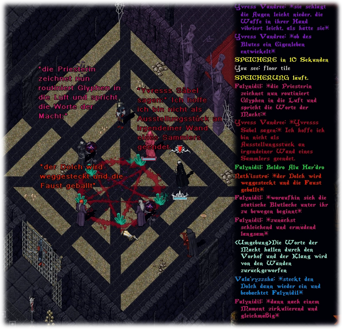 Angeleitet von ihrer Mutter Oberin wurden die Priesterinnen dazu gezwungen ihre Grenzen auszureizen. Falynidil, die die größten Kräfte zu kanalisieren hatte, wäre beinahe von einer arkanen Überladung erfasst worden, fing sich aber rechtzeitig. Am Wendepunkt ihrer Kräfte angelangt, reagierten die Quarze auf den Zauber und wirkten sich unterstützend aus. Nun wurde der zirkulierende Blutstrom, zu dem das Pentagramm magisch gemacht worden war, nachdem die vier Priesterinnen zuvor einen Teil ihres eigenen Blutes hinzugegeben hatten, zur leitende Verbindung der magischen Energien.