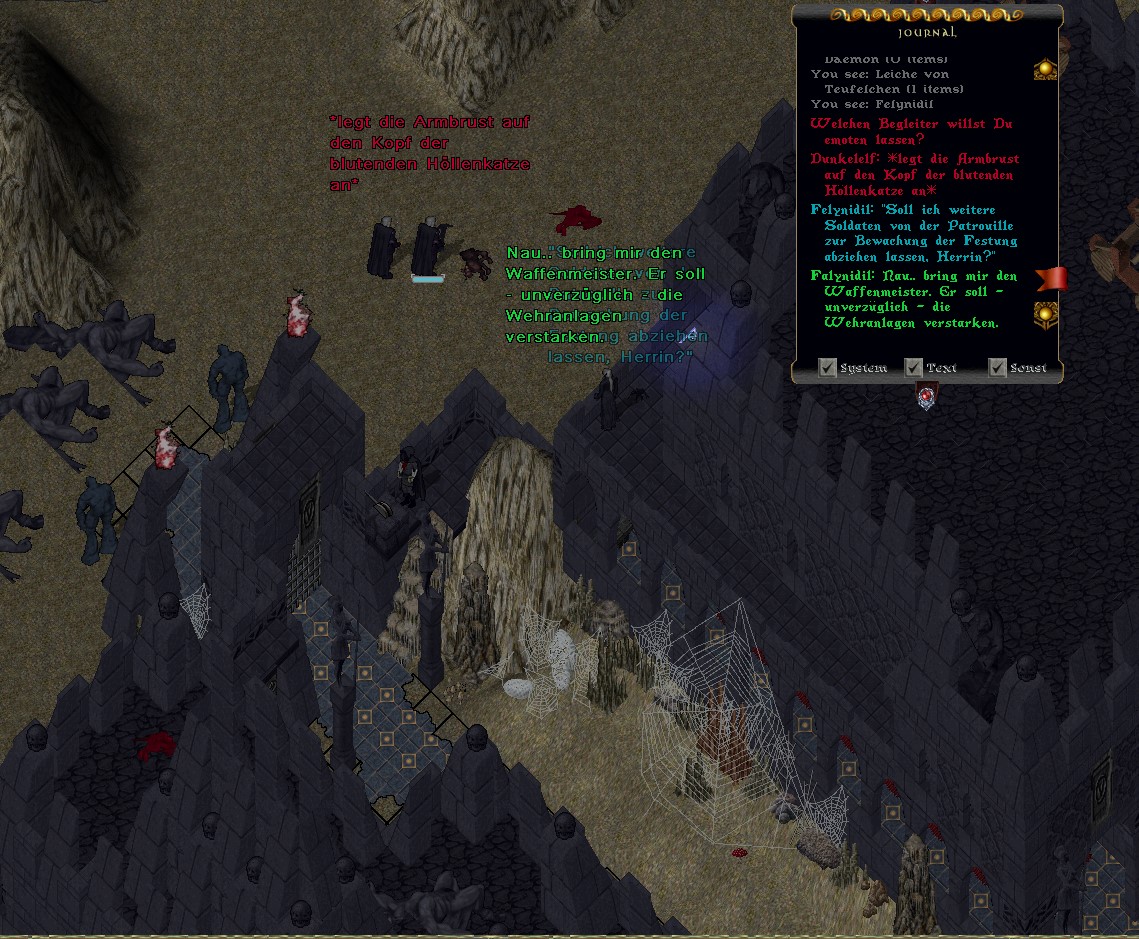 Ich stiess auf eine Gruppe von fast einem Dutzend Oberweltlern, welche die Dämonen beseitigten, die Sold'Orbb belagern. Sie wagten es Erklärungen zu fordern, doch die einzige Antwort war die Erlaubnis mit der Ausdünnung der Dämonen fortzufahren. Ich habe sie eine Weile beobachtet, ob sie den erteilten Auftrag auch ausführen, wenn sie schon in unser Reich eindringen.