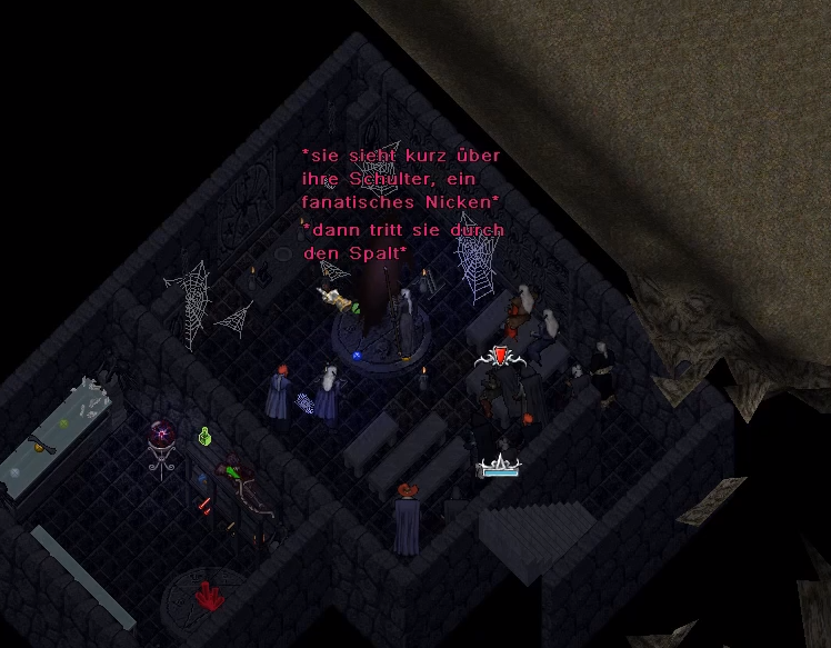 Die Luft knisterte, als sie am Höhepunkt des Rituals die Worte der Macht intonierte, woraufhin das das Videnn ulu Lloth finster zu glimmen begann und die Nebelschwaden, die den Raum belegt hatten, einsog. Alle Anwesenden blickten gebannt nach vorne, als pure negative Energie aus dem Amulett ausströmte, nein förmlich ausgespuckt wurde und einen Spalt in die materielle Ebene riss.