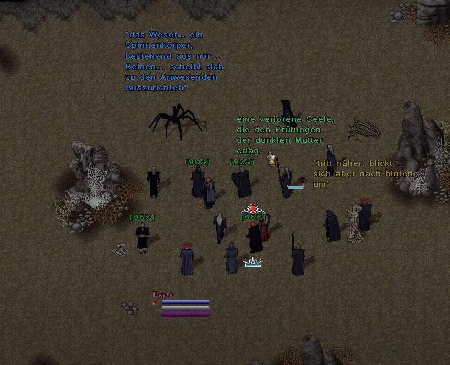 Die Chwidenchans umrundeten nun den Wall und liefen in die Säbel und Angriffszauber des Qu’ellars. Es war ein Gemetzel und Spinnenbeine, Blut und Gedärme übersäten den ganzen Platz. Es kam aber der Eindruck auf, als wäre dies nur die Vorhut gewesen, denn das Klackern und Kratzen von Spinnenbeinen auf Fels nahm weiter zu. Näherte sich eine weitere Legion dieser unbarmherzigen Kreaturen? Nein, es war sogar noch schlimmer. Die wenigen Angreifer, die frontal vor das Qu’ellar getreten waren, dienten nur der Ablenkung, damit die übrige Horde sich an den Mauern zu schaffen machen konnte und diese einriss. Krachend fiel der Stein zu Boden und eine Flut von Chwidenchas ergoss sich nun aus allen Richtungen auf die Filifars. Es wurde hektisch, als der Waffenmeister zähnefletschend den Vorstoß auf dem Pfad anordnete. Dabei sicherte er gemeinsam mit der den Soldaten sowohl das Voranschreiten, als auch die Nachhut. Einige seiner Soldaten verloren dabei fast das Leben, konnten durch die heilende Magie der Priesterinnen jedoch gerettet werden.