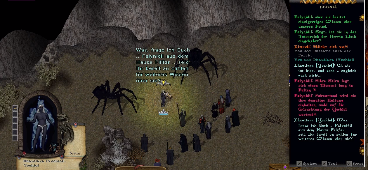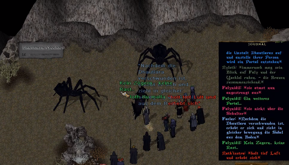 Doch es sollten keine Monster oder Dämonen auf sie warten, sondern drei wahrhaftige Zofen Lloths, die sie kritisch beäugten. Die mittlere der drei Yochlol war keine Unbekannte, denn Dhautlara hatte sich bereits in zahlreichen Ritualen als Sprachrohr der Spinnenkönigin präsentiert und das Qu’ellar beraten. Dies wurde auch den Nicht-Priesterinnen bewusst, als die Yochlol ihre mit Tentakeln bewährte Schleimhaufengestalt gegen ihre Form als charismatische Dunkelelfe eintauschte. Als ranghöchste Priesterin und Ilharess war es an Falynidil die Unterredung zu führen und ihr Eindringen in diese Ebene zu erklären. Sie war sich darüber bewusst, dass Dhautlara sicher wusste, weswegen sie hier waren und das dieses Verhör nur ein weiterer Teil der Prüfung war. Dhautlara wurde von der Plage berichtet, die, in Form von Belfaz, die Kinder Lloths befallen hatte und dass sie einer Spur nachgingen, die Hinweise auf dessen Vernichtung gegeben hatte. Ihre Ausweglosigkeit hatte sie schlussendlich zum Äußersten greifen lassen und, bedingt durch das Schweigen der Göttin durch Anrufungen, den Weg in die Dämonennetzgruben unabdingbar gemacht.