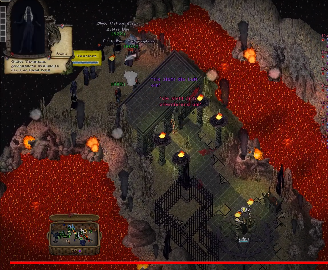 Kaum angekommen, drang ihr stickige, heiße Luft entgegen, dessen hoher Schwefelgehalt ihr in den Augen schmerzte. Dies war ein sonderbarer Ort, der offenbar zwischen den Ebenen existierte oder vielleicht sogar eine eigene kleine Dimension war. Umsäumt von einem Lavasee führte der Pfad durch einen Vorbau zu einem Käfig, vor dem eine Frau, eine Dunkelelfe, angekettet ausharrte. Ihr fehlte eine Hand und ihr Kopf hing schlaff herunter, sodass zunächst nicht ersichtlich war, ob sie noch lebte. Diese Befürchtung verflüchtigte sich jedoch, als Falynidil näher trat und die Bewegung auf der Brust der Frau registrierte – sie atmete: dies musste sie sein, Quiloe.