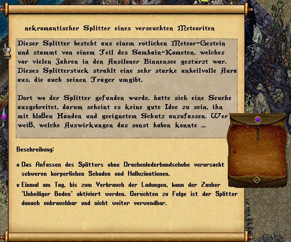 Nachdem Du schriebst, dass Dir der Gedanke kam, die Seuche vielleicht zu unserem Vorteil zu nutzen und unsere Feinde zu schwaechen, kam mir die Idee, selbst einen der Splitter zu bergen. Da ich ohnehin am Abend mit Livius und Xapoa verabredet war, um die verbliebenen Nebelfelder auszumerzen, erschien mir dies als gute Gelegenheit. Doch leider kam es anders als gedacht- einer derjenigen, der bei der Bergung half, wollte den Splitter nicht herausgeben.