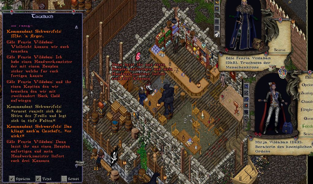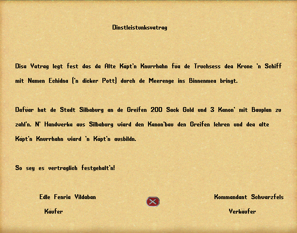 „Grüße Euch, Ingvar, Sohn des Eriks.“, sprach Mirja den Mann förmlich an, nachdem auch der letzte Abenteurer endlich von ihm sein Kopfgeld abholte. Ingvar grunzte und sah sie überrascht an. Natürlich kannten sie sich, war Ingvar doch in Nordhain aufgewachsen. „Mirja… warum bist du so förmlich?“, er kniff sofort misstrauisch die Augen zusammen. Sie grinste. „Weil ich heute im offiziellen Auftrag des Ordens der königlichen Ritterschaft hier bin, Ingvar.“, sie tippte dabei kurz auf das Emblem, welches sie als Beraterin der Ritterschaft und Unteroffizier a.D. auswies. „So so…“, er sah sie abwartend an. „Wir benötigen einen fähigen Kapitän, welcher ganz oder zumindest vorrübergehend in den Dienst der Krone eintritt.“ „Und den suchst du bei mir?“ „Naja, im speziellen bei der Gilde der Schwarzen Greifen. Welche du vertrittst.“ Ingvar schnaufte. „Aye, die vertrete ich, aber ich verwalte nur die Kopfgelder… alles andere liegt nicht wirklich in meiner Hand. Die Kapitäne unterstehen Kommandant Schwarzfels.“ „Ist es möglich ihn zu sprechen?“ Ingvar hob die Schultern. „Ich kann ihm ausrichten, dass du eine Audienz wünschst.“, erwiderte er hochgestochen und grinsend. „Im Ernst… im Augenblick befindet er sich nicht im Rostanker, aber es lässt sich sicher arrangieren, dass du einen Termin bekommst, wenn er in ein paar Tagen vorbei kommt.“ „Na, das klingt doch gut. Wo ich wohne, weißt du ja hoffentlich noch. Dein Vater ist sich nämlich nicht so sicher, dass du noch den Weg nach Nordhain kennst!“