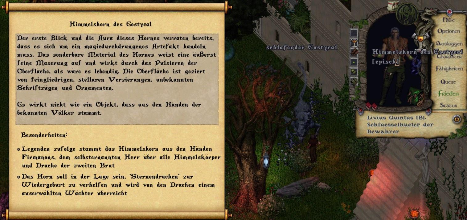Der Drache bat uns, durch einen Weg den er fand, um mit uns zu kommunizieren, dass wir etwas für ihn suchen mögen. Es handelt sich dabei um ein Horn, ohne den er offenbar nicht leben kann. Dieses Horn wurde vor Jahrtausenden in drei Stücke geteilt, wovon der Aufenthalt zweier uns inzwischen bekannt ist, sofern uns niemand zuvor kam.