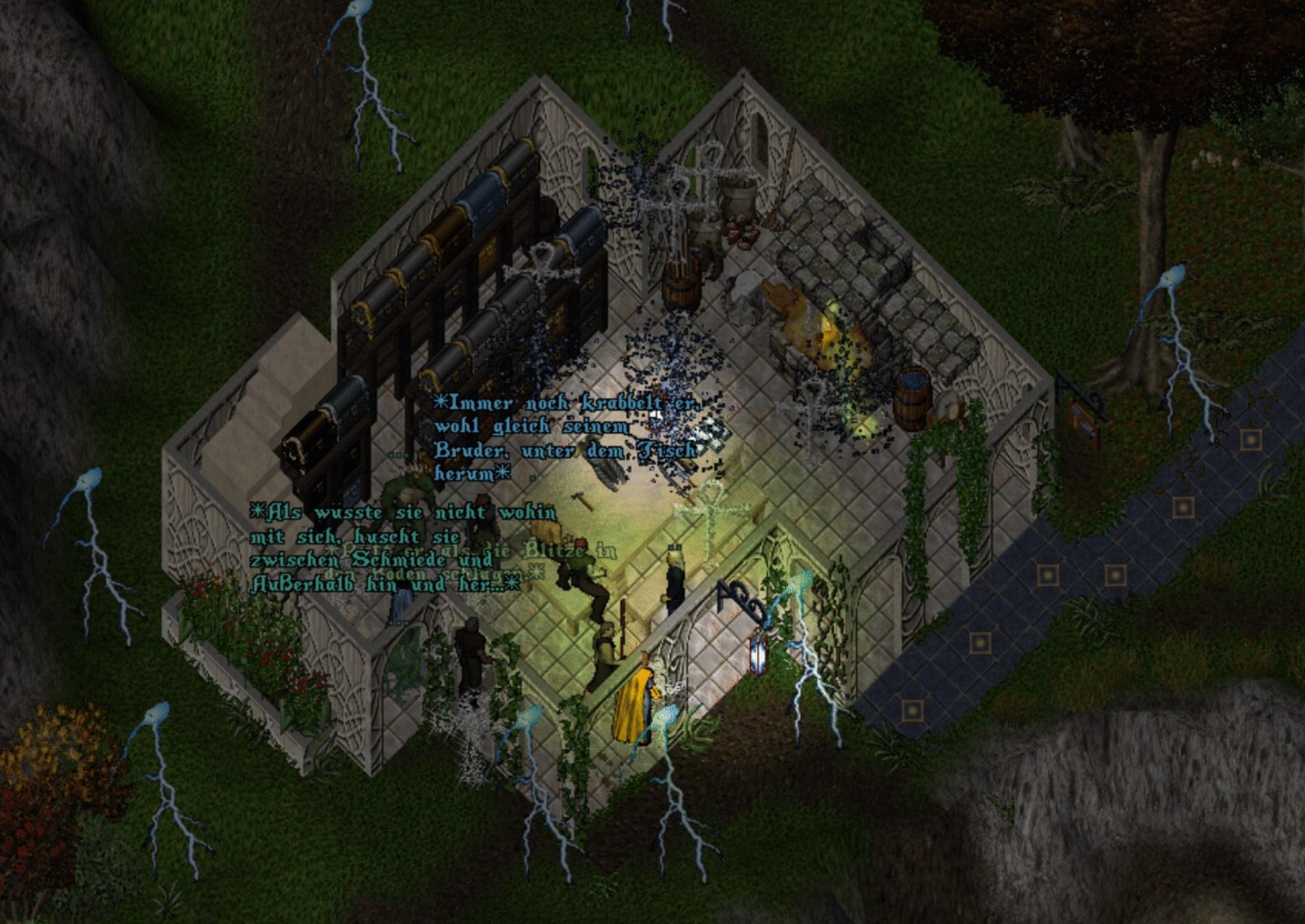 Für Naeldir war der Moment gekommen, sich besser einige Schritte von der Esse zu entfernen, denn ihm war klar, dass die Hitze, die dort erreicht werden würde, deutlich stärker sein würde, als er es mit Kohle zu schaffen vermochte. Er wollte sein Glück nicht herausfordern. Trotz des Abstands merkte er die enorme Hitze dennoch, aber sie war aushaltbar, zumindest für jemanden, der es gewohnt war, und der Schutz, den die Priesterin des Amazonenvolks ihm vor dem Feuer gewährt hatte, tat seinen Teil dazu. Sie alle sahen und spürten, wie Magie entzogen und ausgestrahlt wurde und was für Effekte es mit sich brachte. Es sah eher nach einem heillosen Chaos aus, durch plötzliche Blitzeinschläge um die Schmiede verstärkte sich dieser Eindruck nur umso mehr. Draußen Blitze, innen magische.. was auch immer. Es war jedenfalls weder gut, draußen, noch drinnen zu sein, also konnten sie lediglich möglichst weit weg von der Esse ausharren.