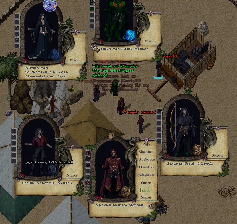 ..seine Gedanken glitten weiter und sein Erschaffer nahm vor seinem geistigen Auge Gestalt an. Tidus..ein wahres Juwel..doch auch bisweilen genauso schimmernd. Ihr inniges Band zwischen Ihnen ließ beide vieles respektieren, darüber hinwegsehen und doch machte sich Varrak Sorgen um seinen Erschaffer und Bruder. Aufgrund des innigen Studiums, welches er seiner neuen Vertrauten Elyssa gewidmet hatte, war ihm Tidus scheinbar etwas entglitten. Für einen Moment überkam Varrak Scham und Schuld breitete sich in seinem Inneren aus, einem bösartigen Geschwür gleich, welches die Dunkelheit in seiner Seele fast durchbrach. Doch plötzlich brandete ein neuer Gedanke durch seinen Kopf..Tidus war der wesentlich erfahrenere und ältere..wer war er also,das Varrak dachte, sein Bruder würde unbedingt seine Hilfe benötigen? War diese Überlegung nicht der Anfang einer unbeschreiblichen Arroganz, welche dem starken Band zwischen ihnen fast schon Lügen straffte?Das Raubtier in seinem Inneren schien abermals den Kopf zu heben und..zu wittern..dem plötzlichen Gedanken..nachzuwittern..welcher so schnell,seinen eigentlichen Gedankengang unterbrochen hatte.In diesem Moment spürte der junge Vampir eine kalte Berührung an seiner Wange,reflexartig glitt seine Linke in den Reagenzienbeutel, während die Rechte eine knappe Fingerbewegung begann. Erneut spürte er die Berührung und hielt aprubt inne, mit seinem Blick die leicht schlierig wirkende,violette,schwebende Gestalt seiner Vertrauten Elyssa fixierend. Ihr schemenhaftes Antlitz lächelte, ihre fast durchscheinende Hand berührte mit den Fingerspitzen das Gesicht des Vampirs. Augenblicklich unterbrach Varrak seinen Zauber und erwiederte das Lächeln. So musste er seine Vertraute offenbar unbewußt gerufen haben, dies war in letzter Zeit einige Male passiert.Sie schien zu spüren, wenn er Rat benötigte oder aufgewühlt war. Ja, auf Elyssa konnte er sich blind verlassen,dankbar nickte der geisterhaften Erscheinung zu und blickte wieder in die Nacht hinaus.Er würde ein Auge auf seinen Bruder haben, doch gab es noch andere Gegebenheiten, um die er sich endlich kümmern musste..