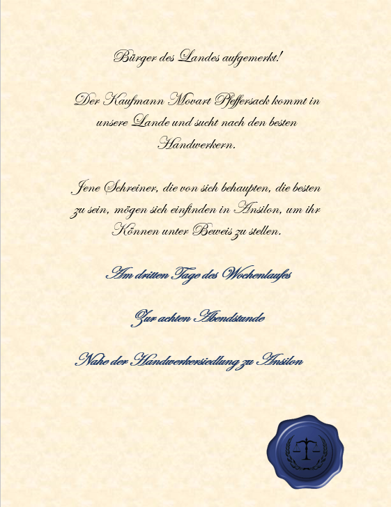 *Nachdem sich nur eine Schreinerin gefunden hatte und einige Zuschauer vor Ort waren, entschied Movart, den Wettbewerb für den Tag als beendet zu erklären, ein neuer Tag sollte gewählt werden und er zog sich in sein Zimmer in der Taverne zurück.*