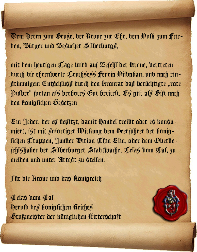 *Knappen der königlichen Ritterschaft werden spät des Nachts noch aus der Burg entsandt um Aushänge an den wichtigsten Orten im Silberburger Umland bishin nach Winterberg zu überbringen und dort anzuschlagen. In Silberburg werden die Kadetten des Ordens entsandt um die Wachstuben aufzusuchen und die Aushänge dort zu verteilen.*