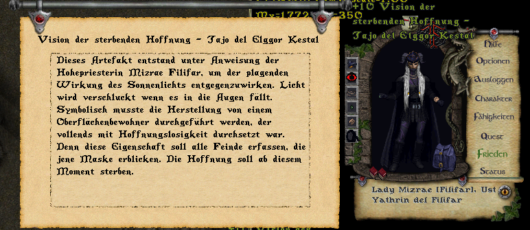 Diese Hoffnung wurde durch ein privates Gespräch nur weiter zerstört. Er würde getötet werden, wenn sie ihn nicht mehr brauchen. Dies hatte er bereits befürchtet. Die Worte von Chalithra'Xune hatten ihm seine schlimmsten Befürchtungen nur bestätigt. Sie schien sich nicht für ihn zu interessieren. Doch umso mehr dafür, der hohen Priesterin eine Lektion zu erteilen, die sie in Schmach hüllen wird. Und so begab er sich daran eine kleine Überraschung in die Maske einzubauen, die nicht nur die Trägerin, aber auch alle Dunkelelfen mehr als nur ärgern wird.