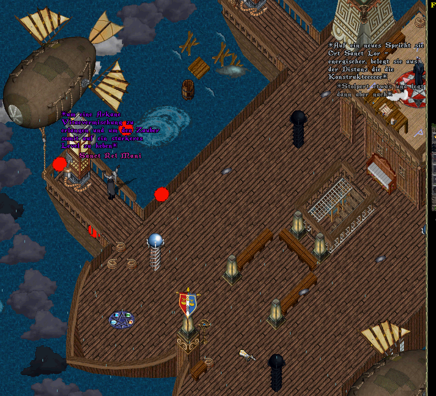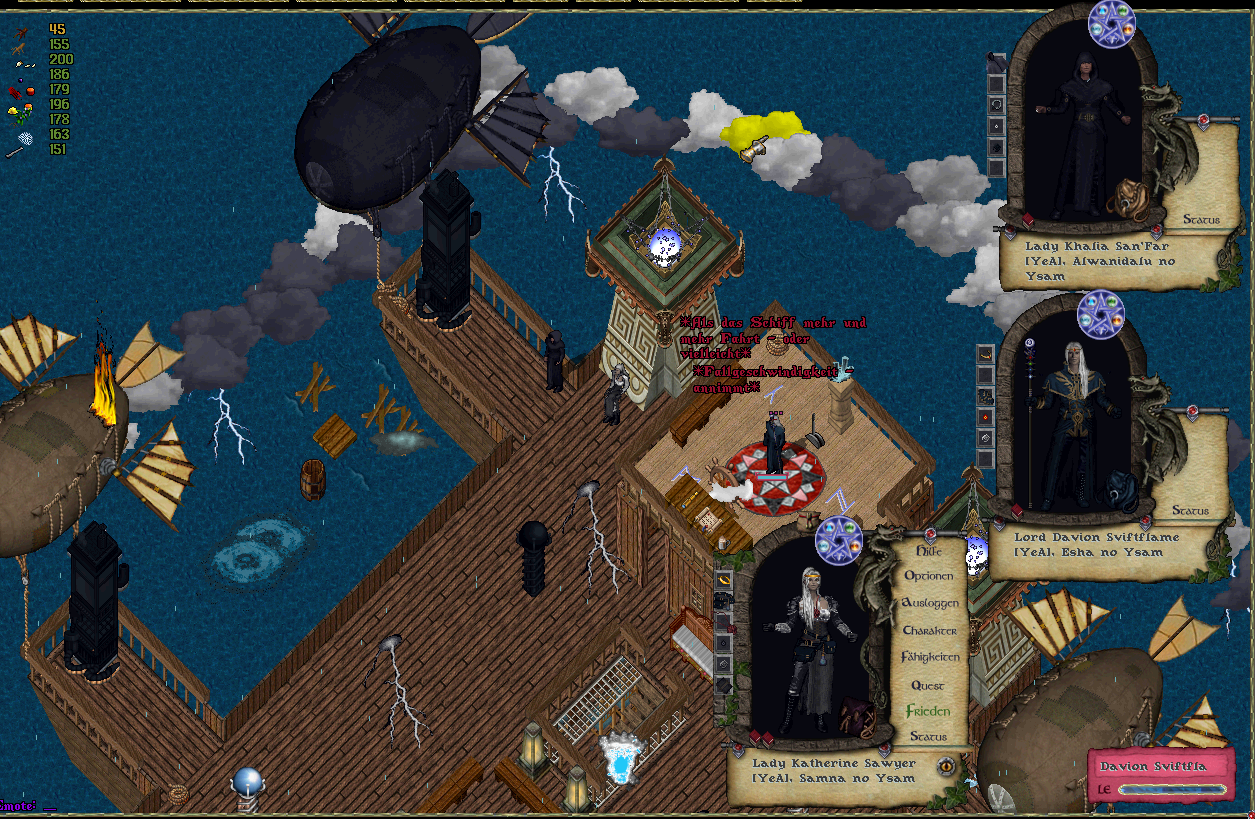 Verzweifelt versuchte man die Zeppeline samt Apparaturen mit Schutzzauber zu versehen. Katherine mischte ihr eigenes Blut in die Schutzzauber und bewirkte damit eine Arkane Viteavermischung, dass die Schutzzauber auf ein höheres Level setzen... doch auch das brachte nichts. Die Schutzmagie wurde von einem einzigen Blitz durchschlagen, dass eigentlich kein Zweifel übrig blieb, dies war kein "Normales Unwetter". Irgendwas oder irgendwer griff die Magokraten hinterrücks an.