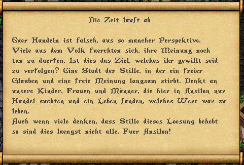 Mir wohl bewusst, dass viele die Art und Weise verurteilen, mit der ich mich in die Position gebracht habe, hier in Ansilon handlungsfähig zu werden. Doch stellt euch selbst die Frage: Nach euren gemachten Erfahrungen der letzten Jahre.. hat sich je gravierend etwas für euch zum positiven verändert.. unter diesem oder jenem Ratsmitglied? Habt ihr je Dinge gesehen, die euch ins Staunen versetzt oder euch verblüfft haben? Wenn eure Antwort, wie auch bei mir, 'Nein' lautet.. dann solltet ihr euch mir nicht verschließen und abwarten, was ich diesem Ort geben kann und geben werde.