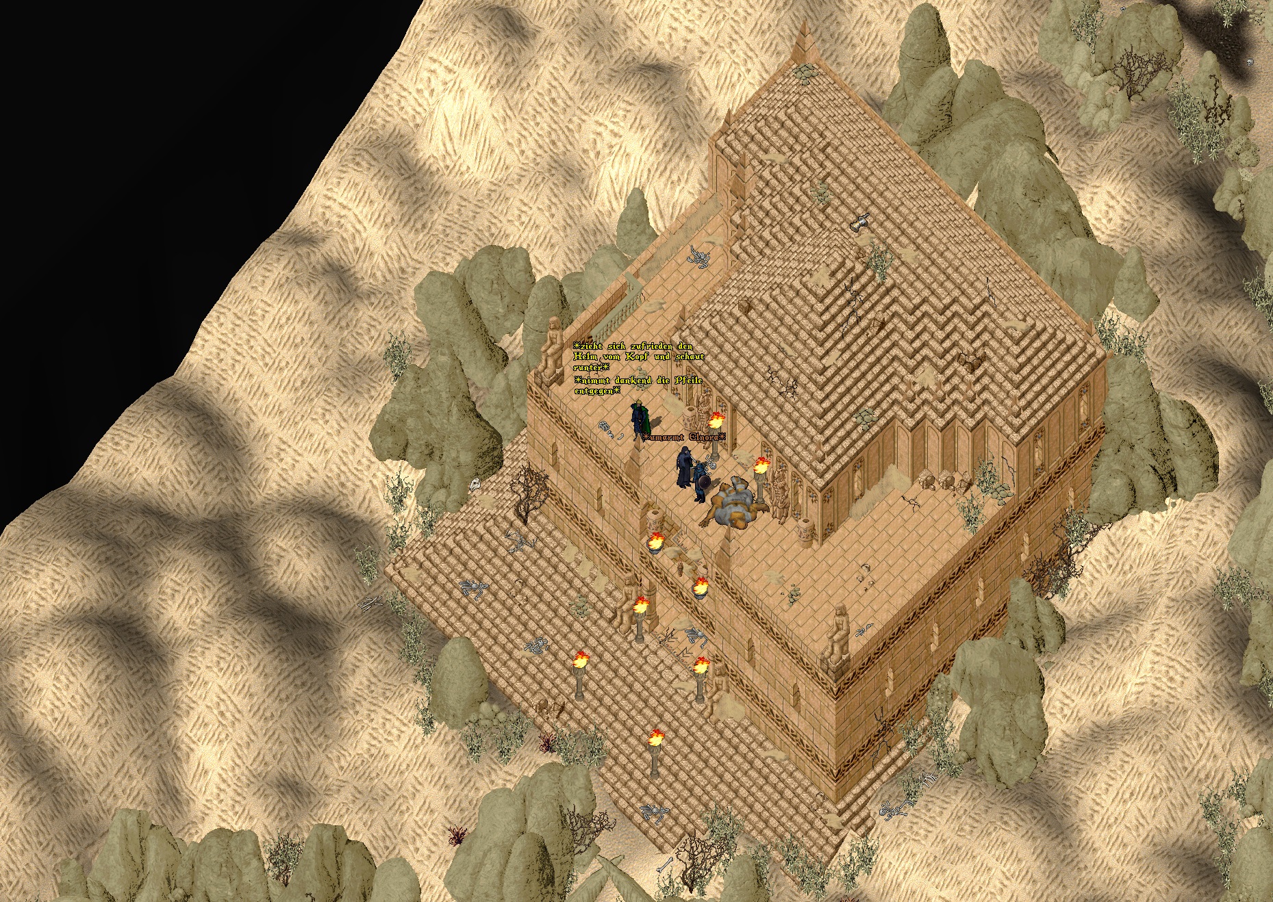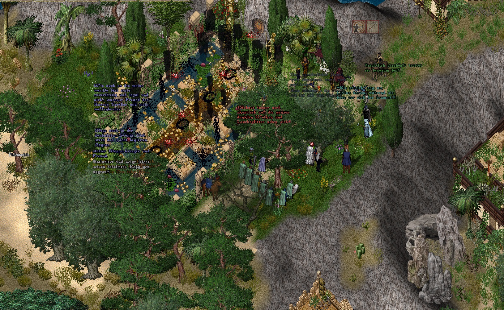 Als Aanatus dann das Bankhaus verließ, lief er Elnora und Soryia über den Weg, die sich gerade am Marktplatz unterhielten. Sie machten sich jagdbereit und als die beiden Aanatus sahen, winkten sie ihn freundlich zu sich und fragten, ob er sie begleiten würde. Er wollte zwar noch auf Bedall warten, da dieser jedoch nicht auftauchte, schloss er sich den beiden Damen an. Schlussendlich landeten sie bei den Zyklopen. „Steine. Rollende Steine.“, sagte Aanatus schon vor der Höhle und versuchte damit, den beiden Damen die Gefahr zu erklären, die er gestern schon mit Ruweena erleben durfte. Soryia ging unbeschwert vor. Man rannte ein bisschen um sein Leben. Aber ohne Steine waren die gigantisch großen Gegner doch nur äußerlich furchteinflößend und keine echte Gefahr, sofern man sie nicht in Gruppen anlockte. Irgendwann erreichten sie den tiefsten Punkt der Höhlen, den Aanatus zuvor vermessen hatte. „Ab hier ist alles neu für mich“, meinte er und auch die Damen sagten, sie seien noch hier gewesen. Vorsichtig gingen sie also weiter und fanden schließlich ein verlassenes Gebäude. Das Gebrüll im ersten Stock verhieß nichts Gutes – aber auch die Titanen konnten das Trio nicht lange aufhalten. Das Gebäude war gesichert, die Rückreise in die Falkenrast wurde angetreten